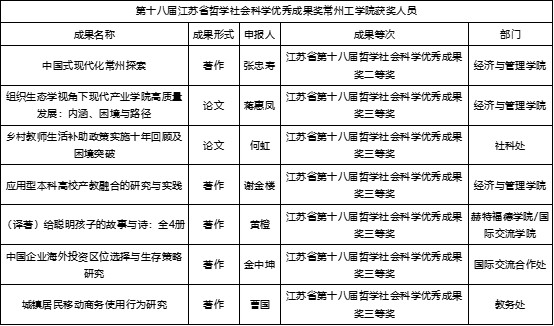 常州工学院在第十八届江苏省哲学社会科学优秀成果奖评选中获奖7项,包括1项二等奖、6项三等奖。在8所省内同类院校中,该校获奖总数位列第一。